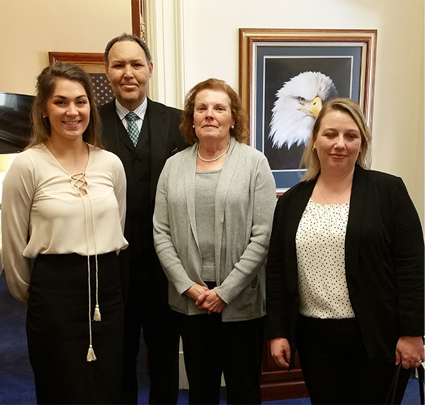 Terri Pardo, Barb Hancock-Henley, Rhonda Doak, Irvin Davis, Teresa Lindberg, and Trey Davis visit Senator Warner’s aide, Lauren Marshall (center).